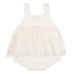 Le linee morbide e la cura dei dettagli rendono questo capo elegante ma allo stesso tempo pratico. I bottoncini sul fondo facilitano il cambio del pannolino, mentre le spalline con chiusura permettono di indossarlo con facilità.