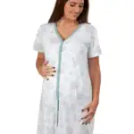 L’apertura frontale con bottoni consente un utilizzo semplice e funzionale, risultando particolarmente comoda durante l’allattamento e la degenza in clinica. La struttura è studiata per adattarsi ai cambiamenti del corpo, senza comprimere ventre e seno, assicurando libertà di movimento e massimo benessere.
