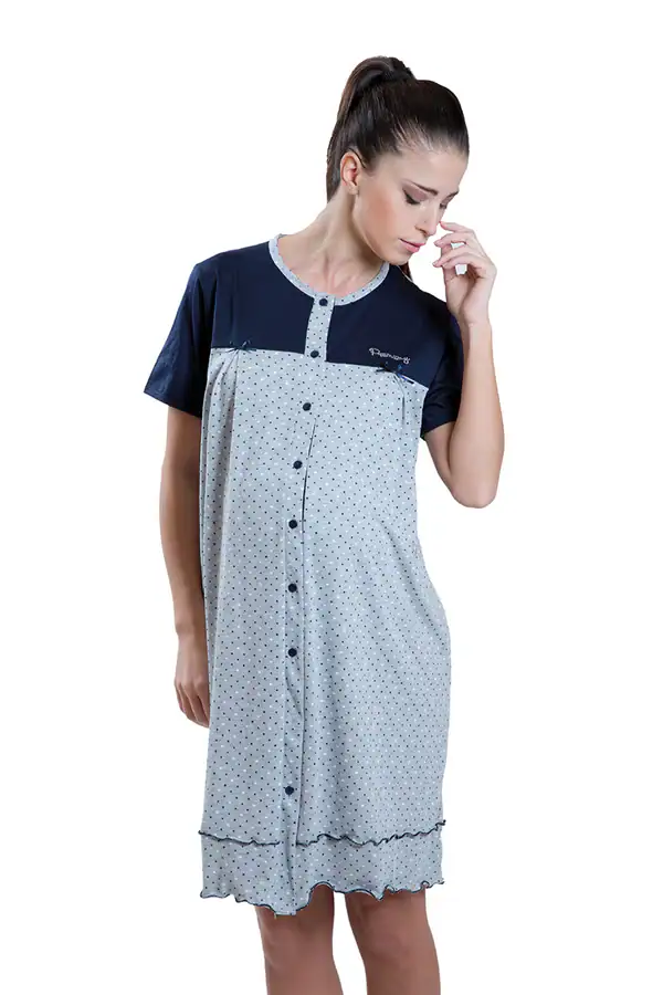 Premamy – Camicia da notte clinica premaman con apertura frontale blu e grigia a pois